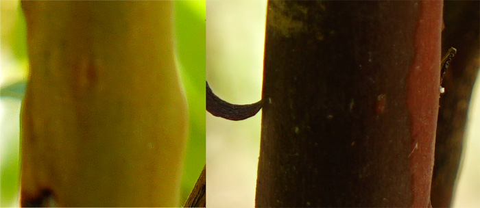 - 樹皮 : 暗赤色、成長期に樹皮は剥がれ白い幹になり暗赤色に戻る
