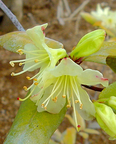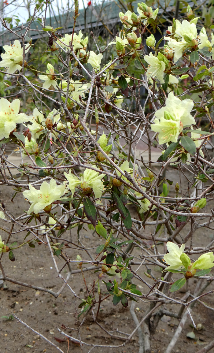 - 花 (4〜5月) : 枝先に径 5cm程の淡い黄色の花を 5〜6個順々に咲かせます。