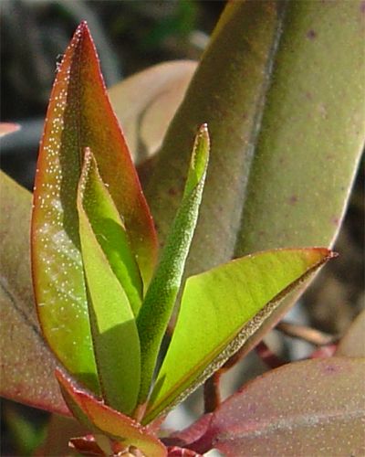 - 葉 : 長さ 3〜8cm の披針形で枝先に輪生状につきます。先端に腺状突起がある。裏表に円形の鱗状の毛があり、裏は密生している。
