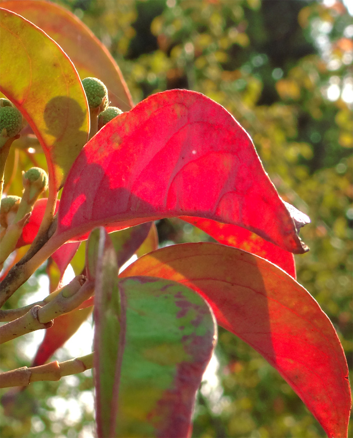 - 葉 : 径10〜15cm程の卵型で落葉のヤマボウシより厚みがあって寒さを凌いでいるのかも。地域によっては古い葉が紅葉します。