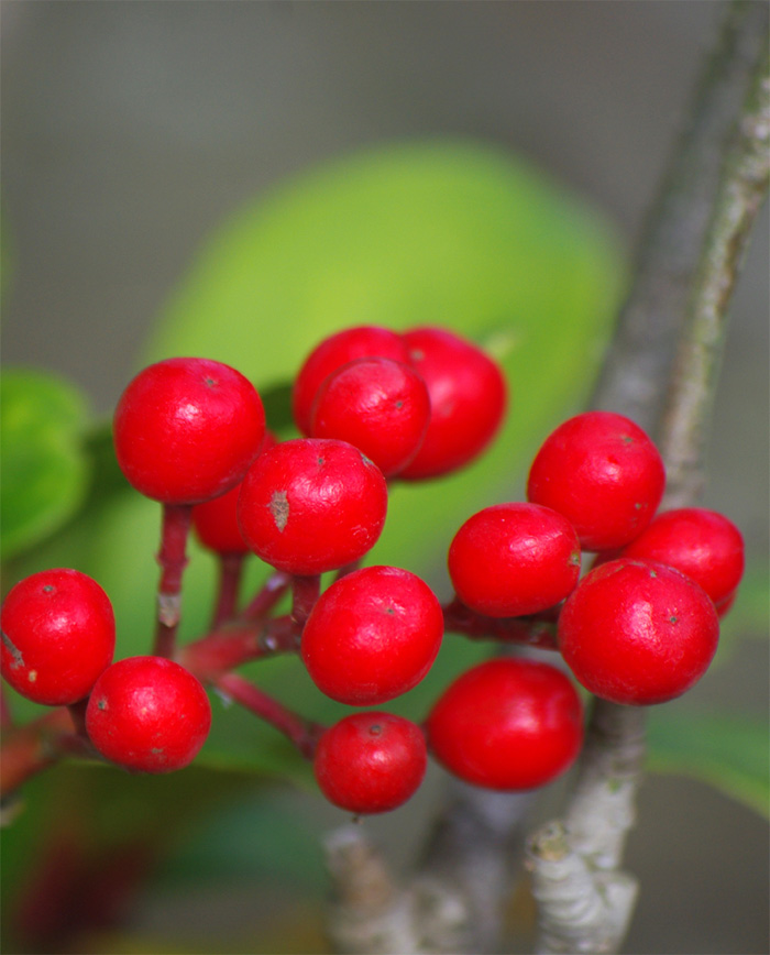 - 実 : 10mm 程の球形で 10月ごろから赤く熟し、 4月頃まで残ります。