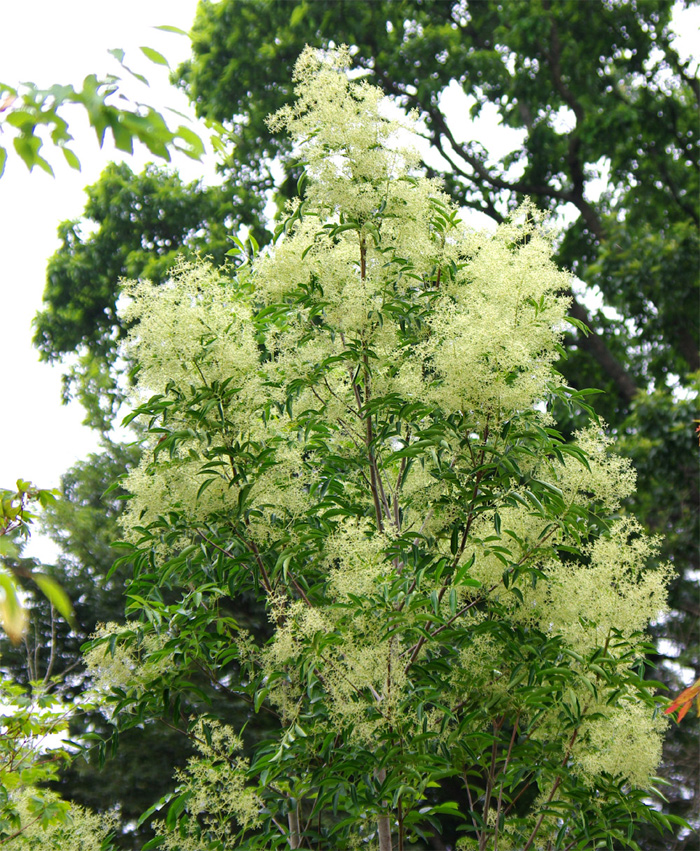- 花 (7月) : 本年枝先や葉腋から円錐花序をだし、白い小さな花を多数つける