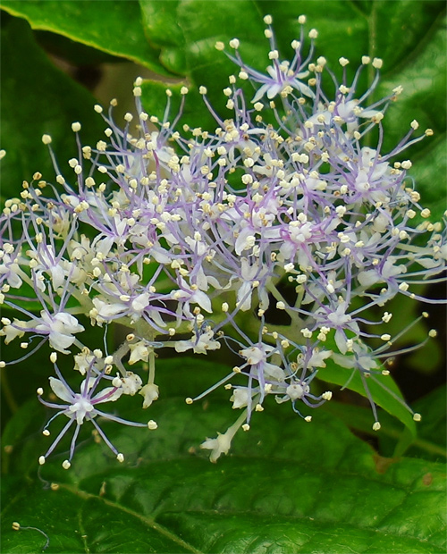- 花 (6〜7月) : 装飾花(ガク)はなく全て極小さな普通花で花びらは白色、花序(カジョ)や雄しべが淡いブルーかパープル系なので全体は淡いブルーに見えると言う方もいます。