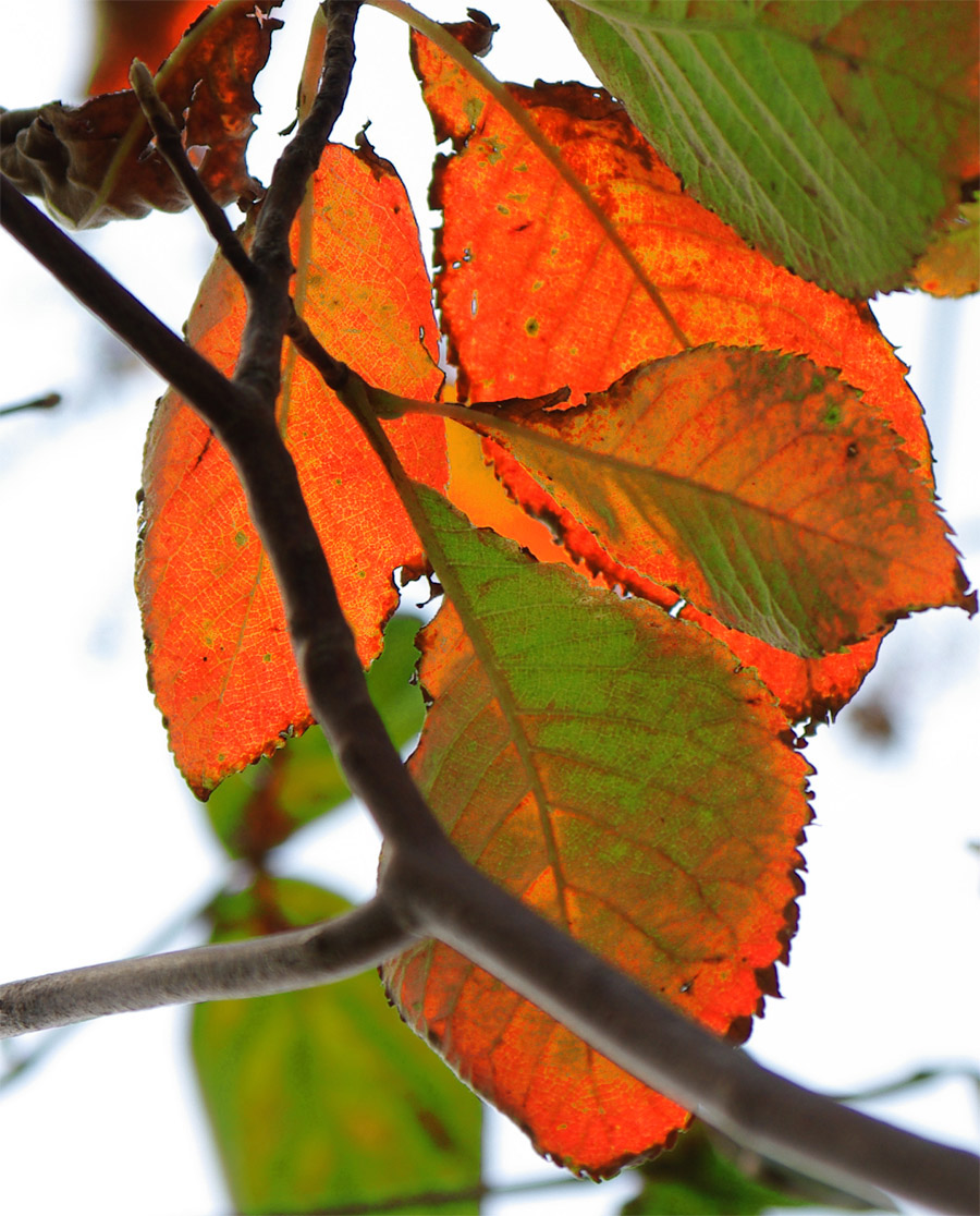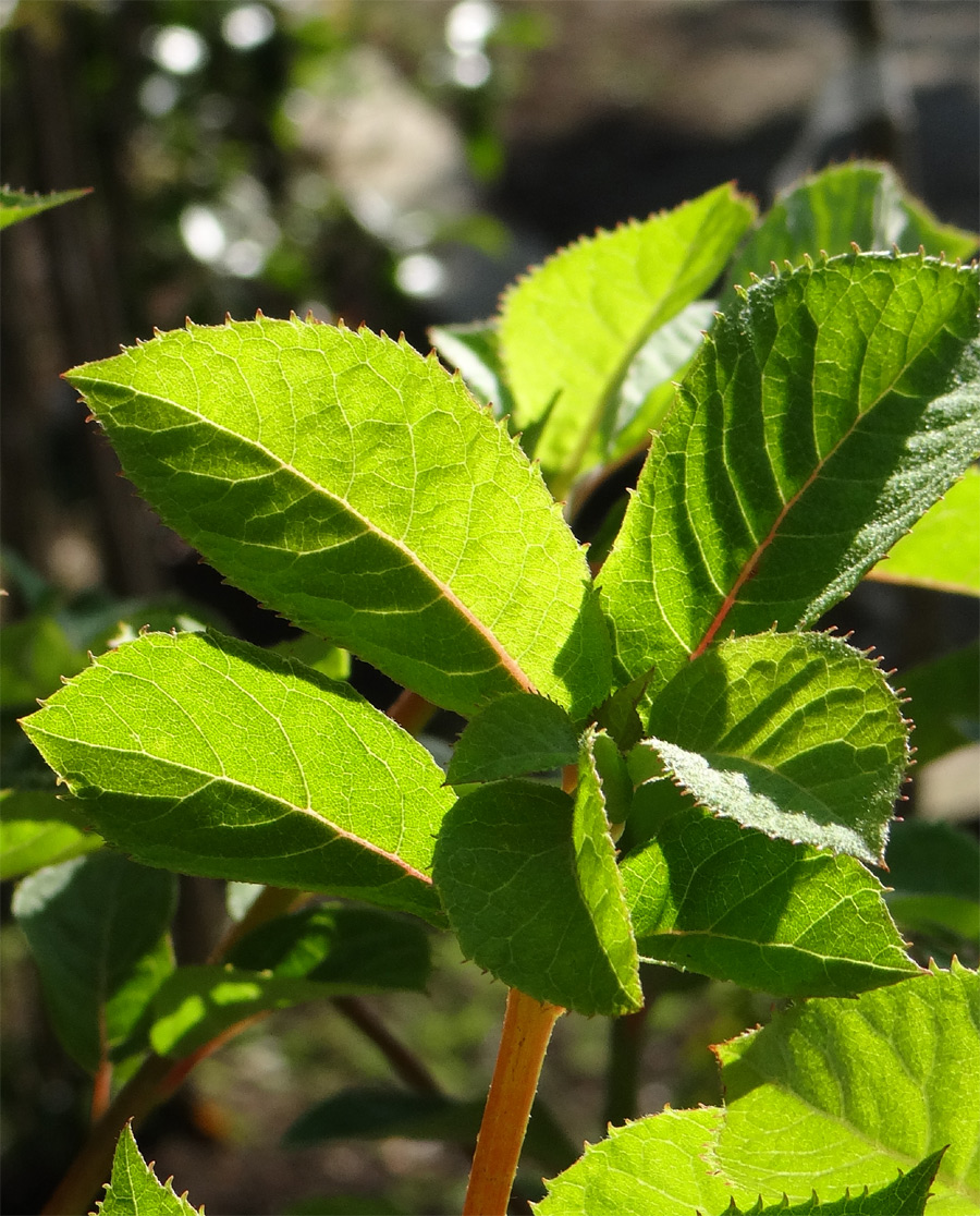 - 葉 : 長さ8cm程の長い楕円形で鋸歯があり、新芽は紫の縁取りがある。秋の紅葉は美しい