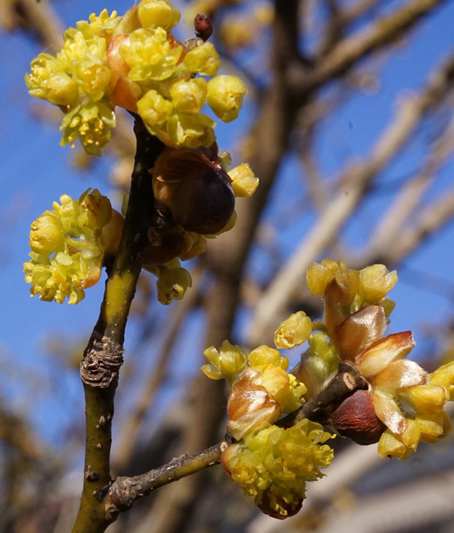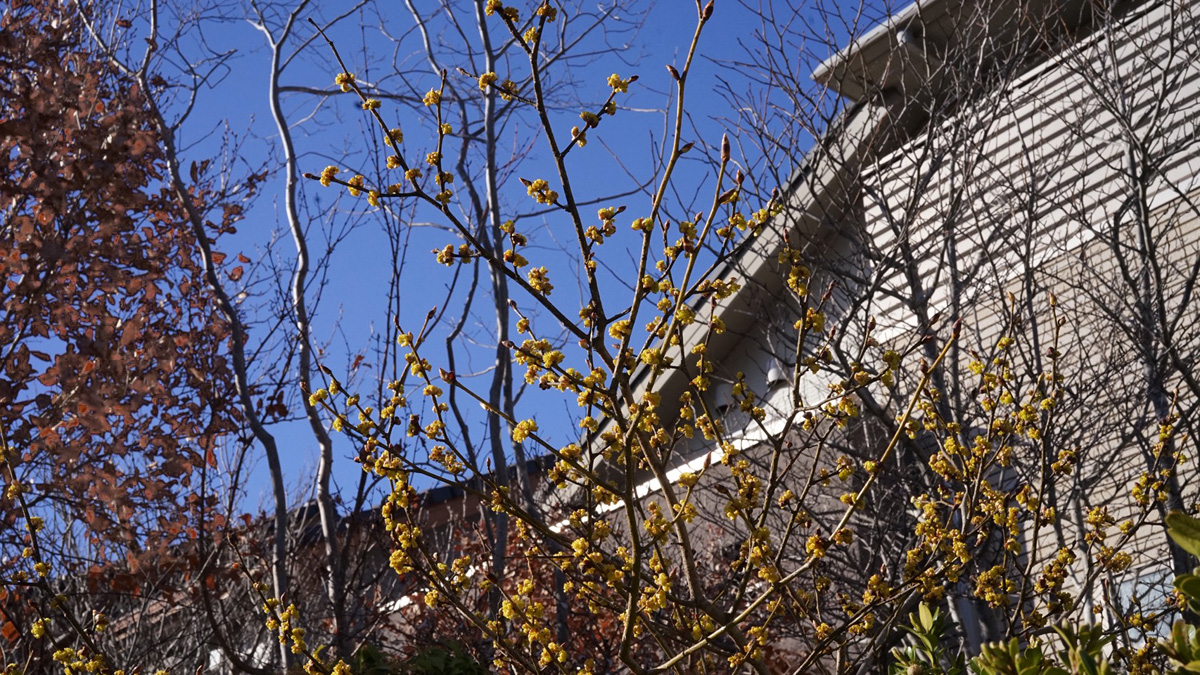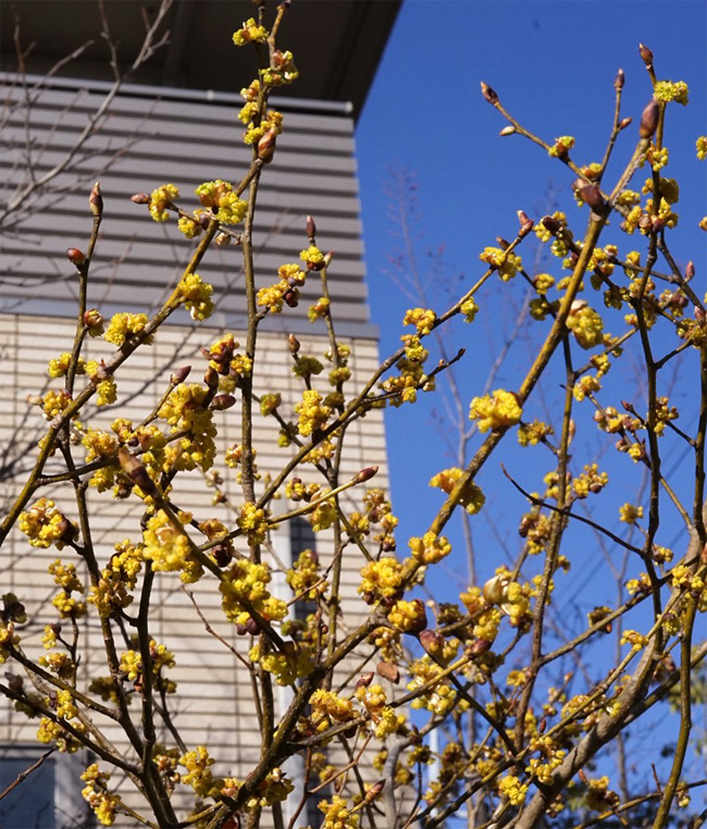 | 左側ヤマコウバシ、中央から黄色い小花はダンコウバイ |