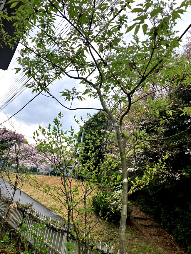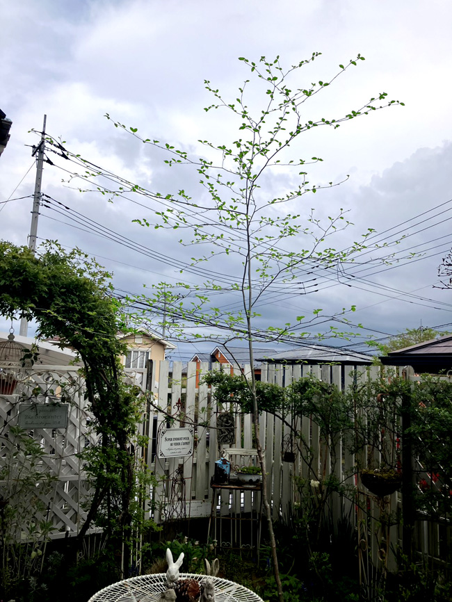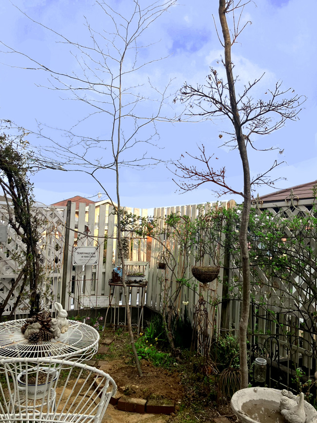 | テーブルに木陰・新しいアオハダ 右コハウチワカエデも樹高変わらず、優秀です。 | 左十数年前に植えたアオハダと右アオダモ、どちらも樹高殆ど変わらずで、優秀です。 |