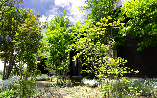庭に入ると森の中です、木々や葉が自然に風を冷やし、