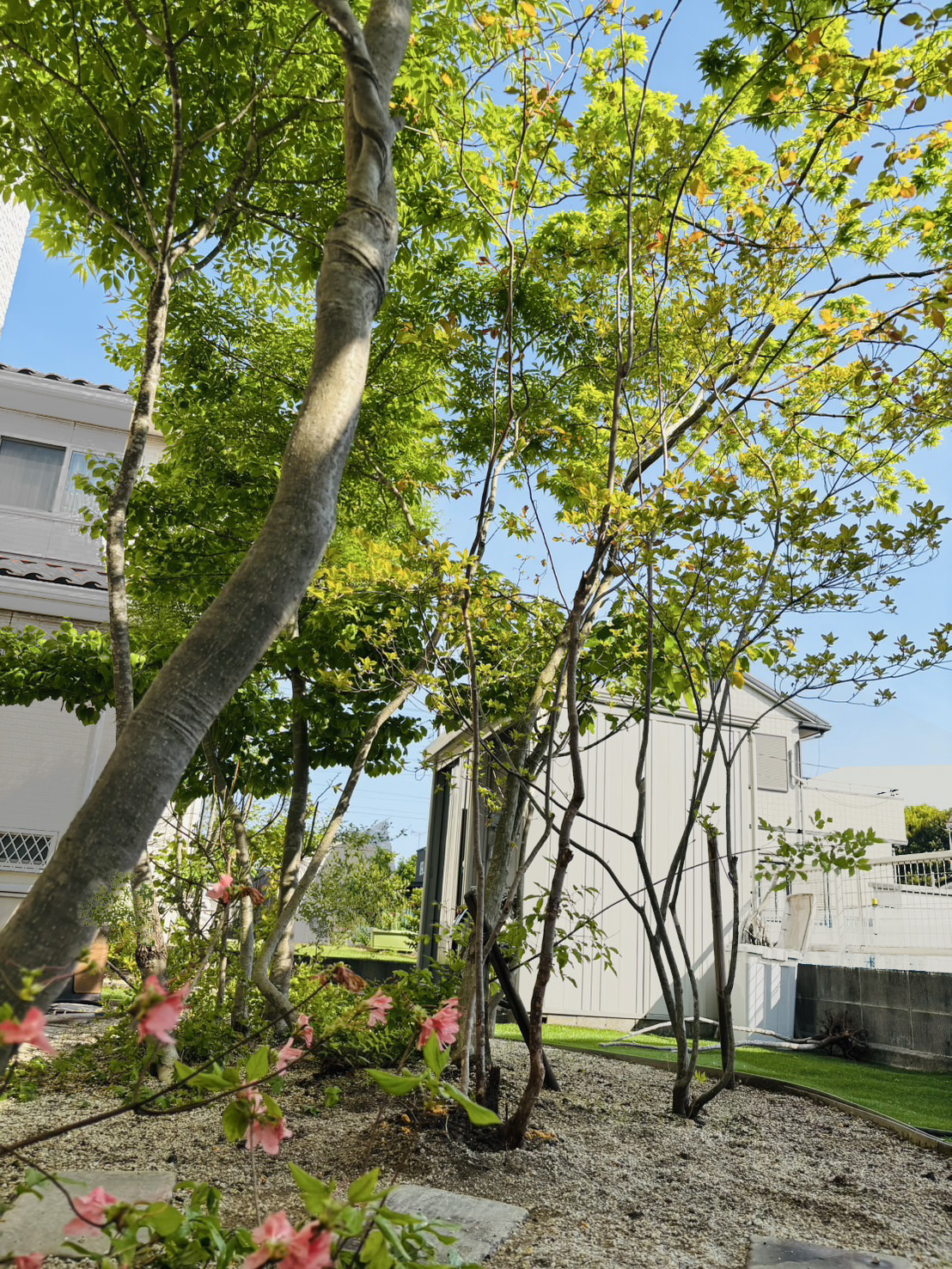 山採り自然樹形の木々、アオハダやアオダモ、アブラツツジ、コアジサイ、ダンコウバイ、ミツバツツジ等で庭つくり中です。