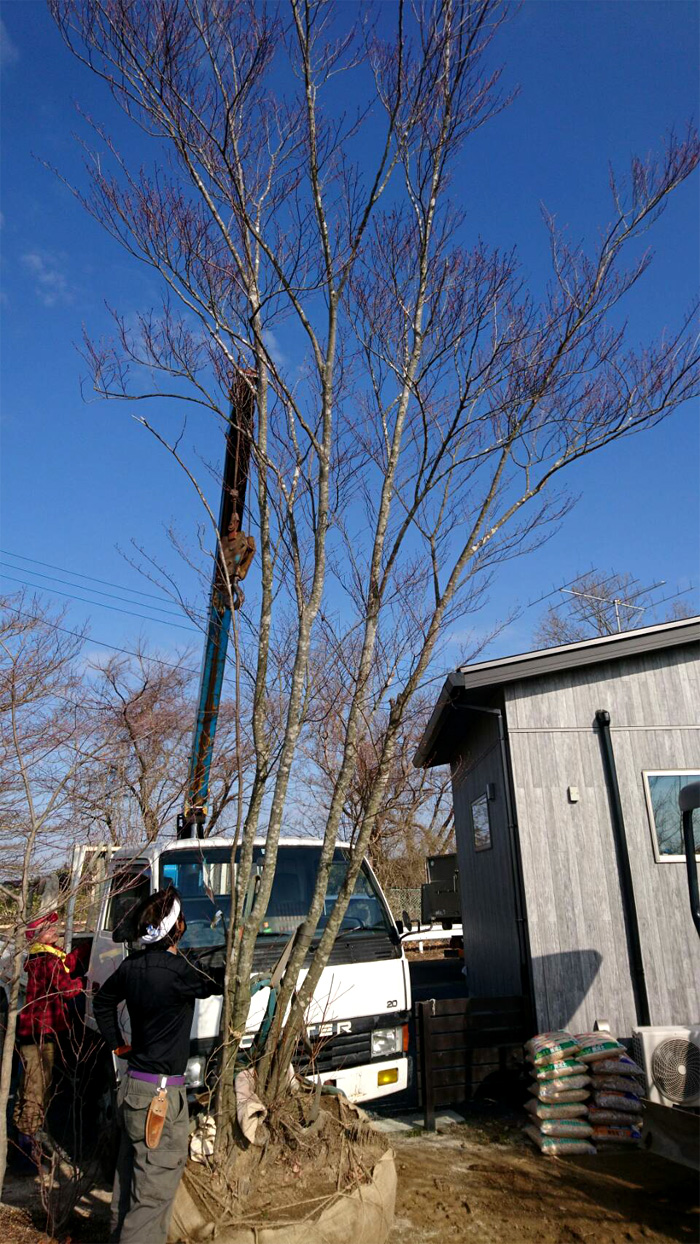 2018/12/16 、オーナー自身で山で決めた6.5mアオハダを山採り後、庭に植え込み。